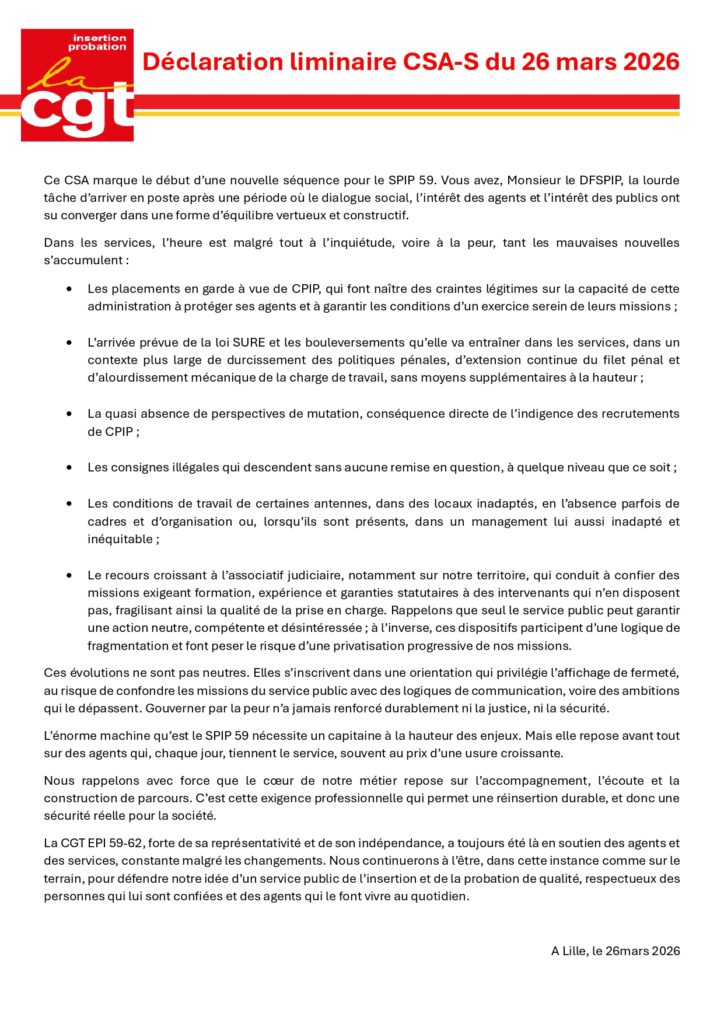 CGT EPI 59/62 : Déclaration liminaire au CSA SPIP 59