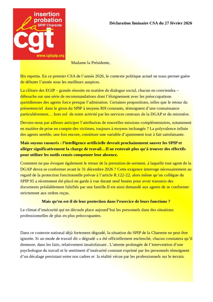 CGT IP 16 : Déclaration liminaire au CSA du 27 février 2026 du SPIP de Charente