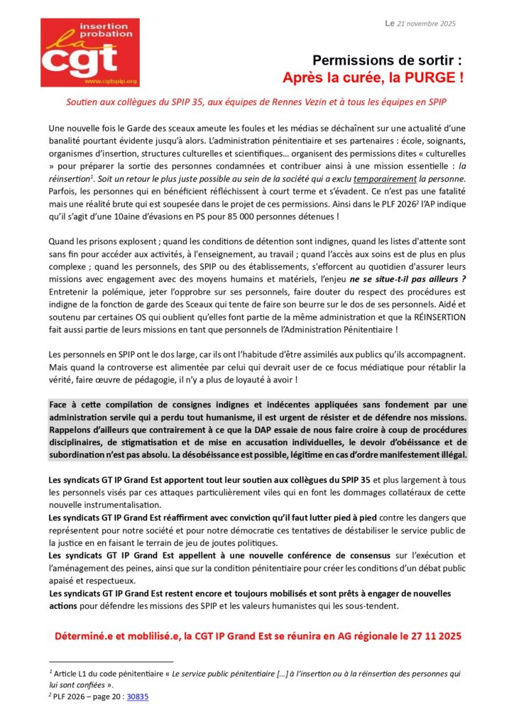CGT IP Grand Est : Permissions de sortir : Après la Curée, la PURGE !