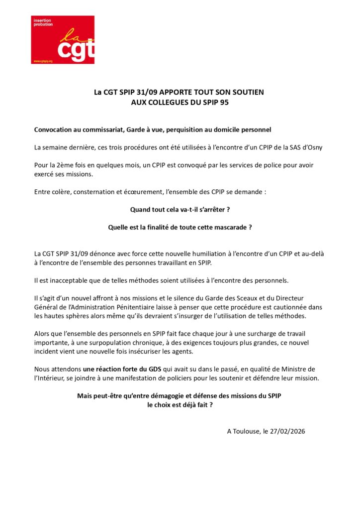 CGT SPIP 31/09 : La CGT SPIP 31/09 apporte tout son soutien aux collègues du SPIP 95