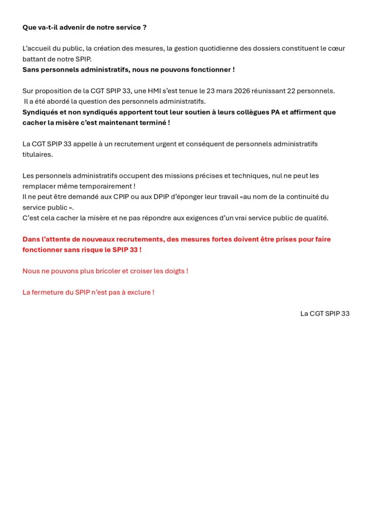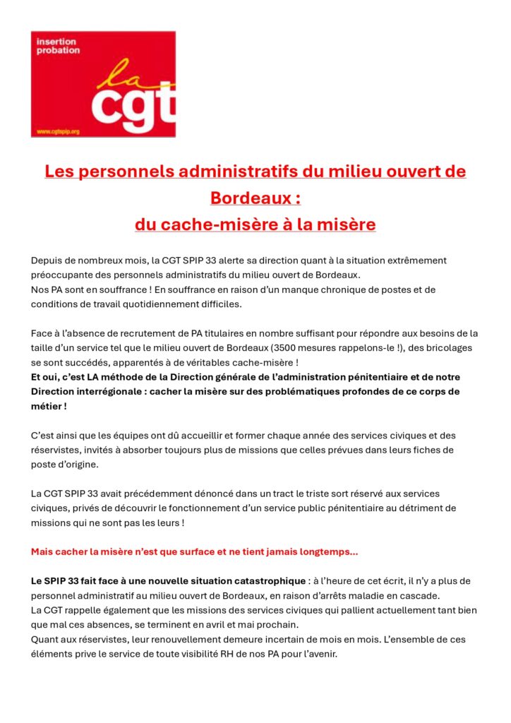 CGT SPIP 33 : Les personnels administratifs du MO de Bordeaux : du cache-misère à la misère