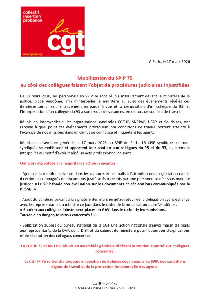 CGT SPIP 75: Mobilisation du SPIP 75 au côté des collègues faisant l’objet de procédures judiciaires injustifiées.