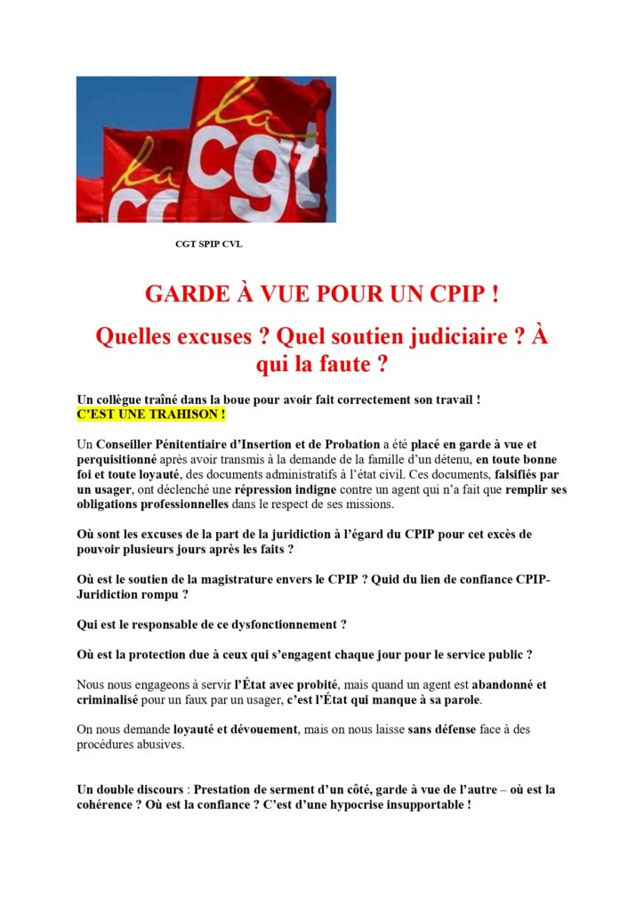 CGT SPIP Centre Val de Loire – garde à vue pour un CPIP ! Quelles excuses? Quel soutien judiciaire? A qui la faute?
