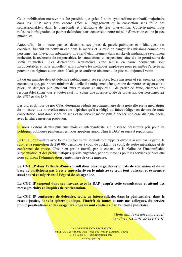 Déclaration liminaire CSA SPIP 2 décembre : Trop c’est trop, pour le moment c’est sans la CGT IP