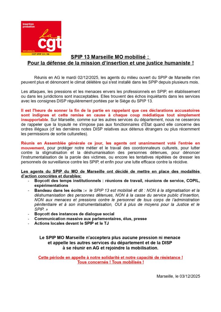 SPIP 13 MO Marseille MO mobilisé : Pour le défense des missions d’insertion et une justice humaniste !