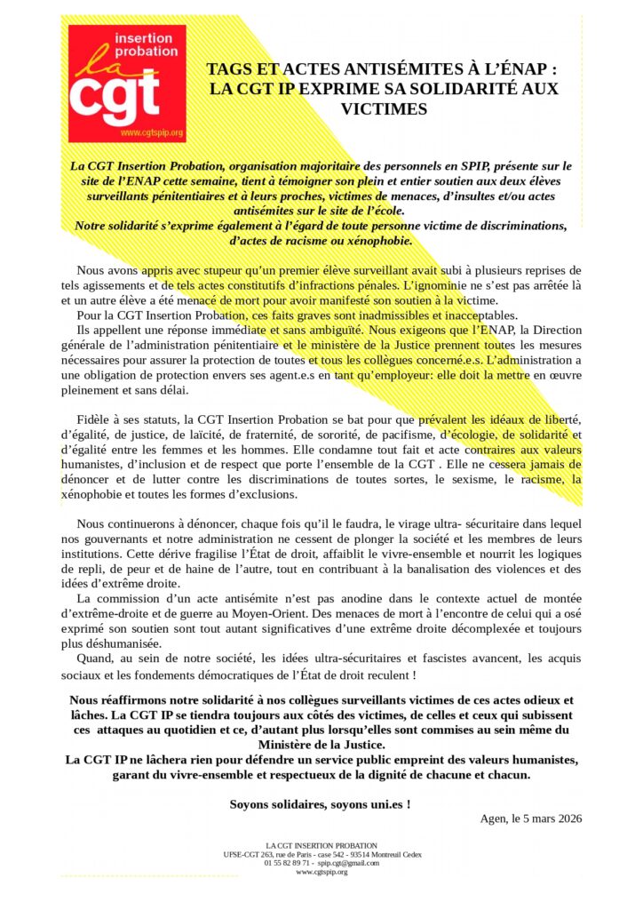 TAGS ET ACTES ANTISEMITES A L’ENAP: LA CGT IP EXPRIME SA SOLIDARITE AUX VICTIMES