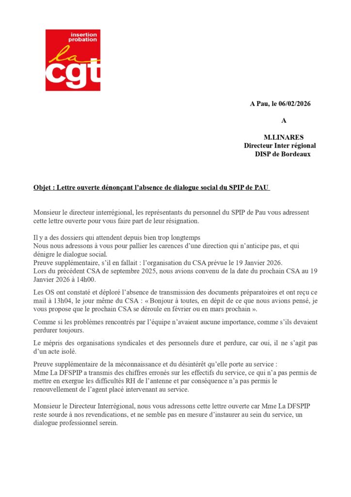 absence dialogue socialCGT SPIP 64lettre ouverte