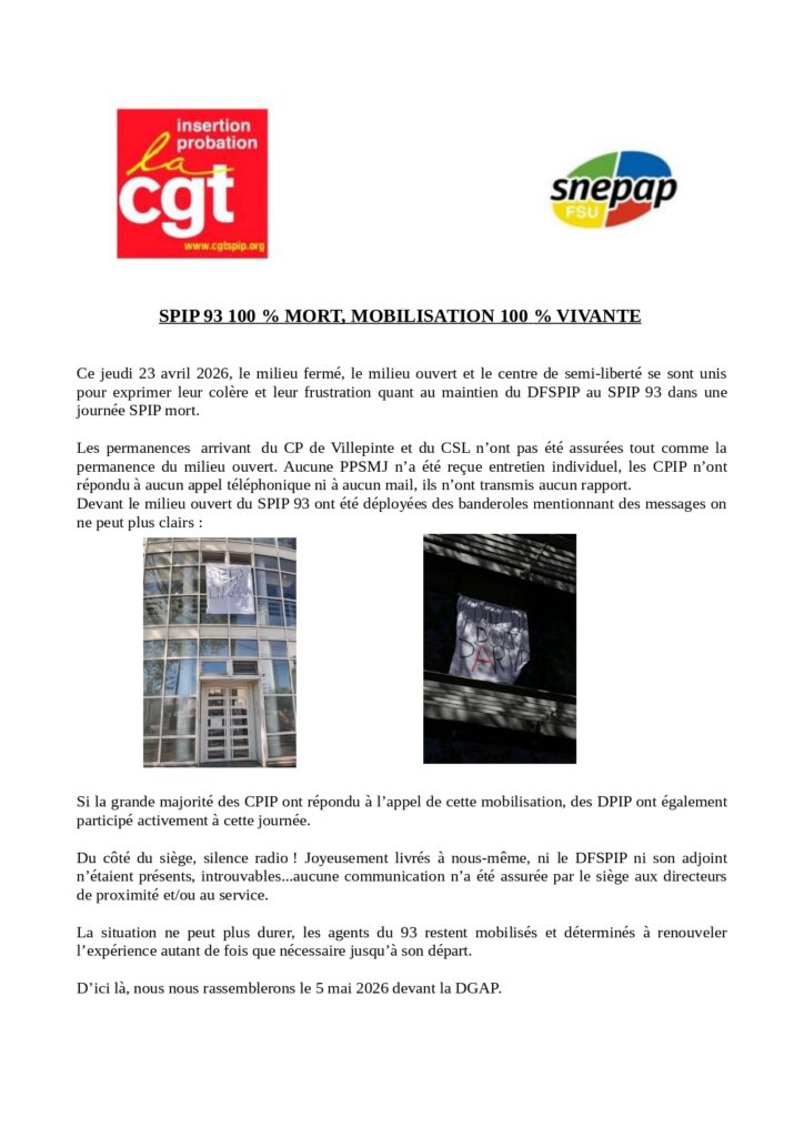 CGT IP 93 – Intersyndicale : SPIP 93 100% mort, mobilisation 100% vivante