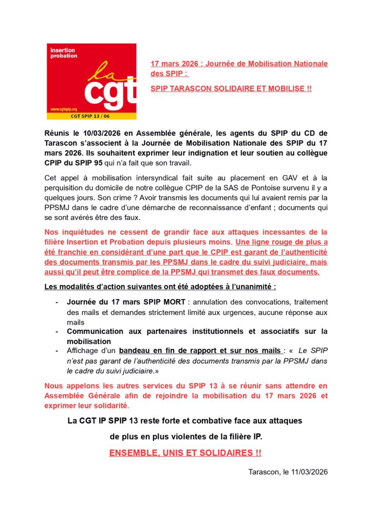 CGT SPIP 13: 17 mars 2026: Journée de Mobilisation Nationale des SPIP. SPIP Tarascon solidaire et mobilisé!