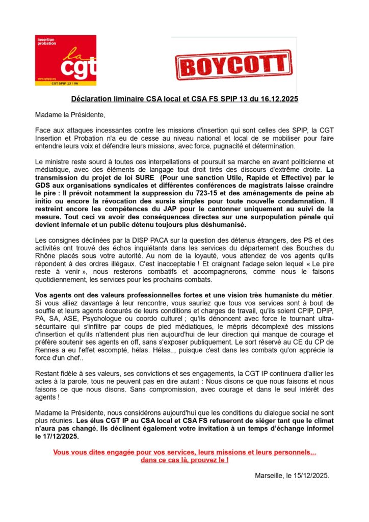 CGT SPIP 13 : Déclaration de boycott du CSA local et du CSA SPIP FS du 16 décembre 2025