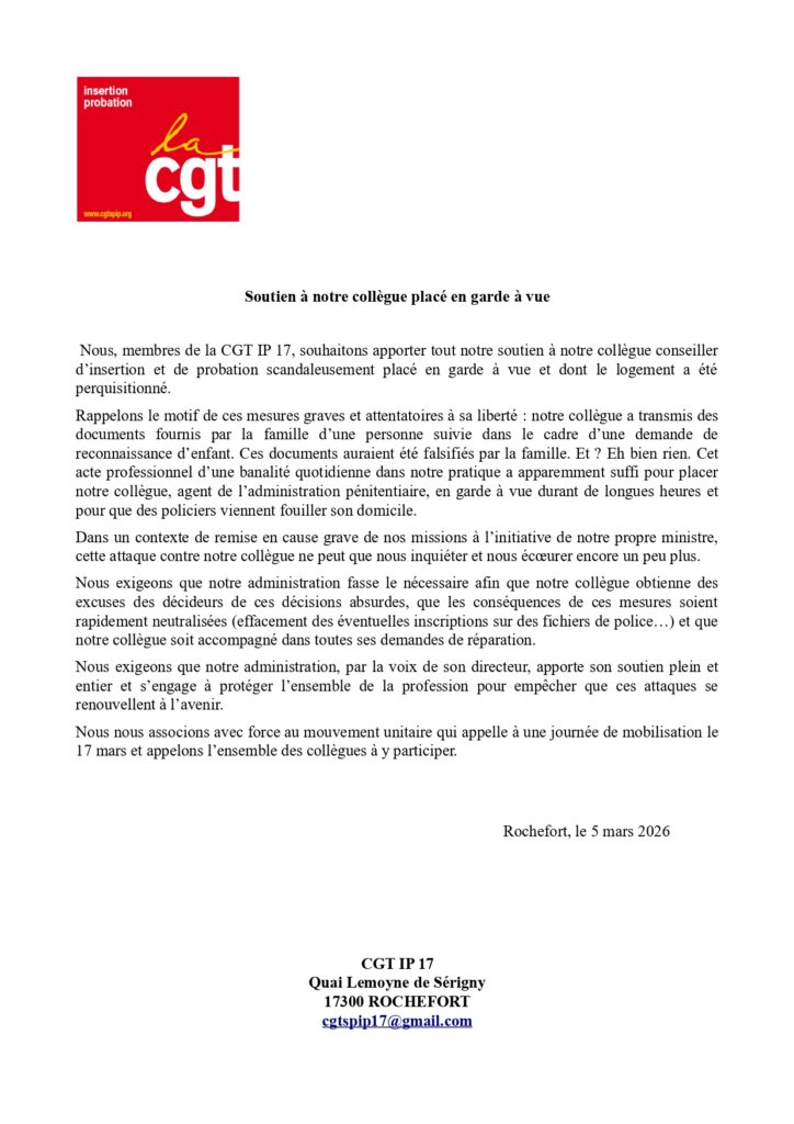 CGT SPIP 17 – Soutien à notre collègue placé en garde à vue