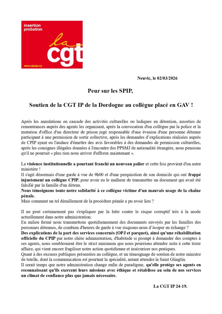 CGT SPIP 24/19 – Peur sur les SPIP, soutien de la CGT IP de la Dordogne au collègue placé en GAV !