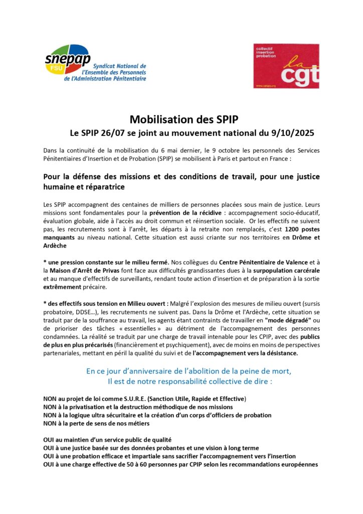 CGT SPIP 26/07 – le SPIP 26/07 se joint au mouvement national du 9 octobre 2025