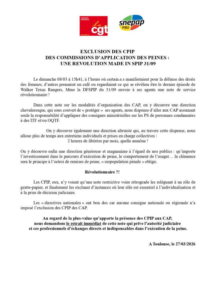 CGT SPIP 31/09 – Intersyndicale : Exclusion des CPIP des commissions d’application des peines : une révolution made in SPIP 31/09