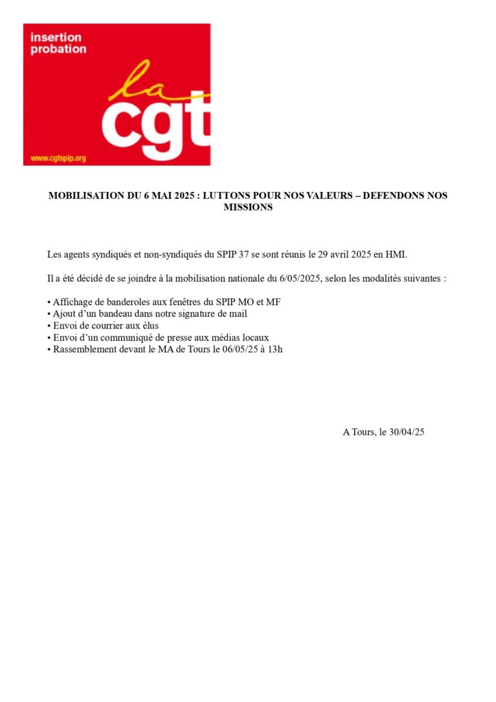 CGT SPIP 37 : Mobilisation du 6 mai 2025 – Luttons pour nos valeurs, défendons nos missions