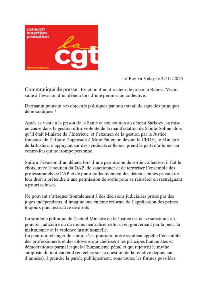 CGT SPIP 42/43/63 – communiqué de presse : éviction d’un directeur de prison à Rennes Vezin suite à l’évasion d’un détenu lors d’une permission de sortir collective