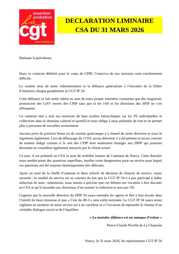 CGT SPIP 54 – déclaration liminaire CSA du 31 mars 2026