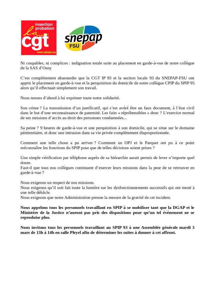CGT SPIP 93 – Intersyndicale : Ni coupables, ni complices : indignation totale suite au placement en garde-à-vue de notre collègue de la SAS d’Osny