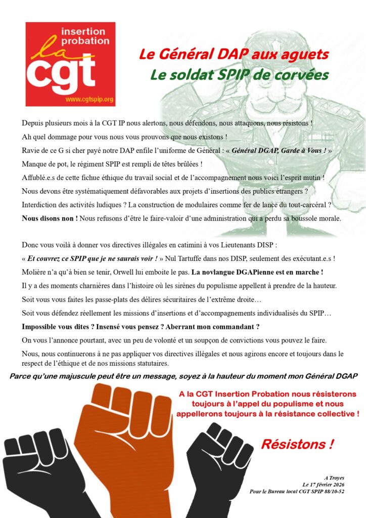 CGT SPIP Grand Est – le général DAP aux aguets, les soldats SPIP de corvée
