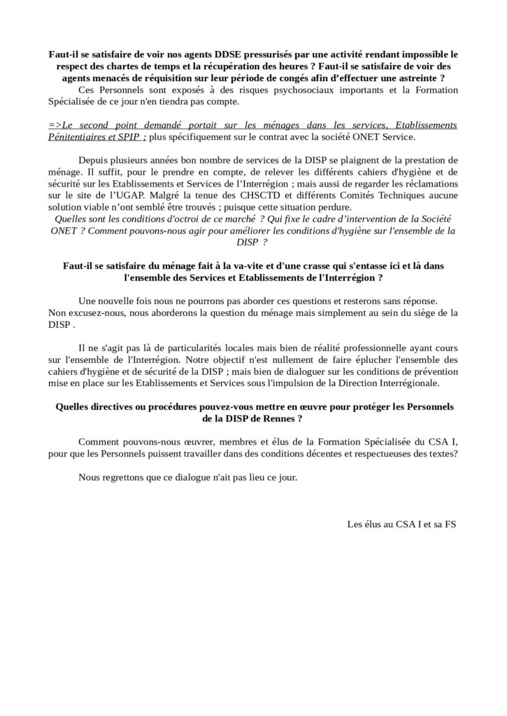 Déclaration Liminaire de la CGT à la Formation Spécialisée HSCT du CSA I de la DISP de Rennes