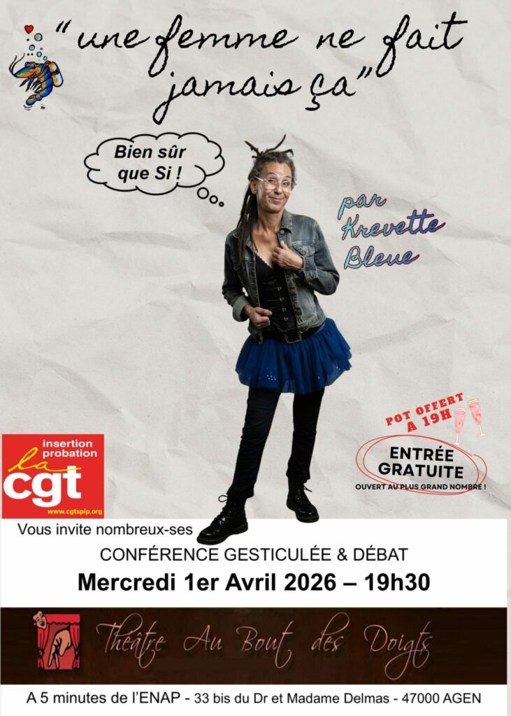 Accès libre, rdv à 19H le 1er Avril 2026 au Théâtre du bout des doigts , à côté de l’ENAP, 33 Bis du DR et Mme DELMAS à AGEN.