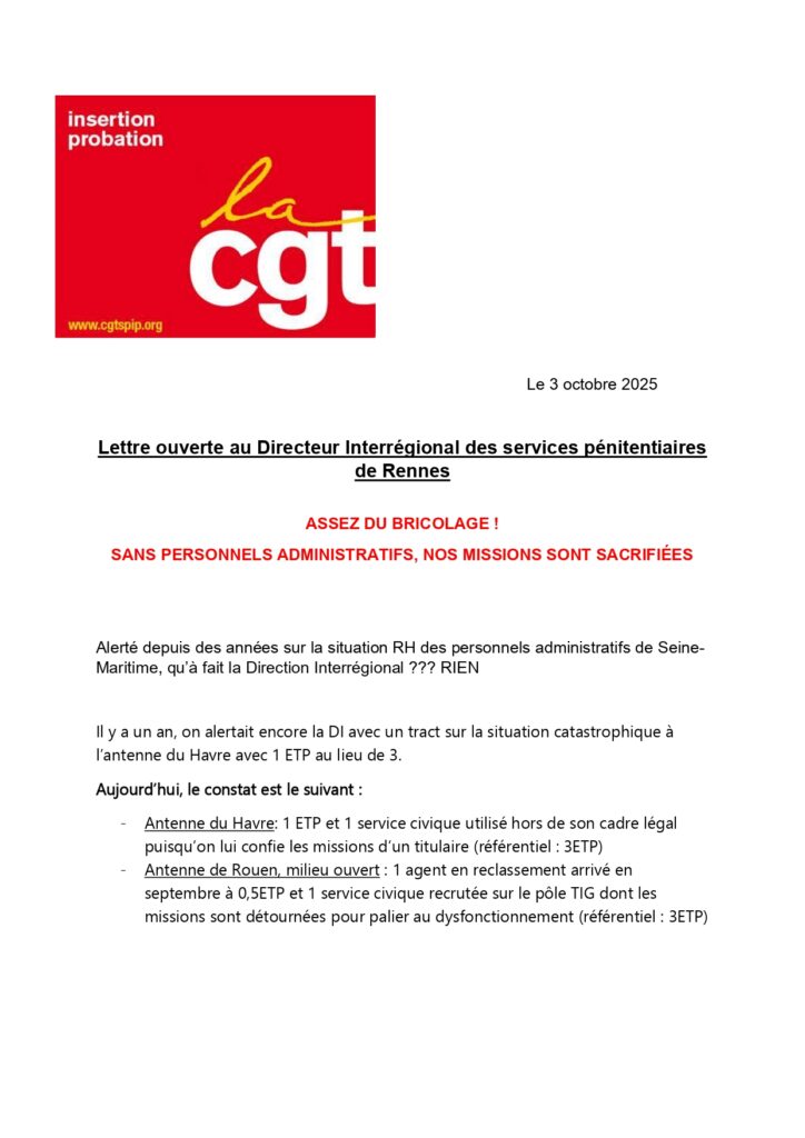 LETTRE OUVERTE AU DI DE RENNES: Assez du bricolage, sans personnel administratif , nos missions sont sacrifiées!