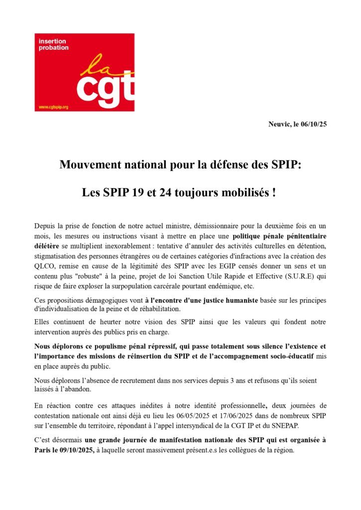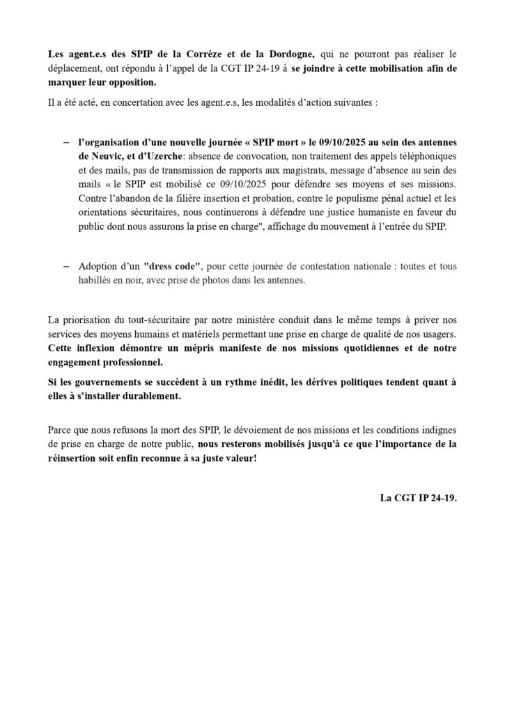 MOBILISATION NATIONALE DU 9 OCTOBRE: LES SPIP 24 et 19 TOUJOURS MOBILISES!