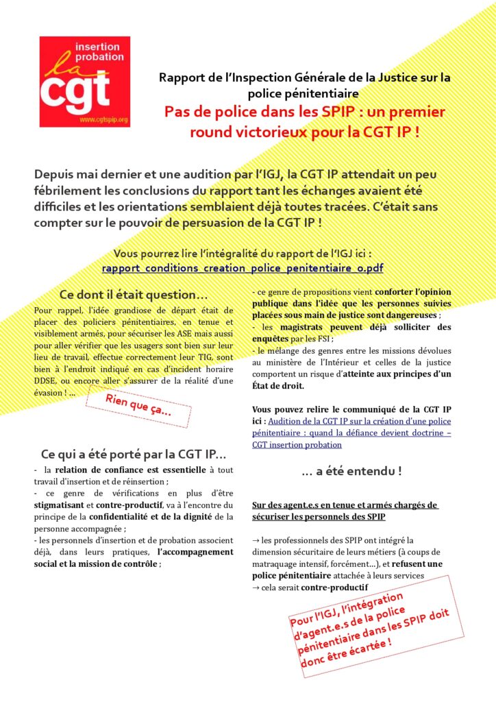 Rapport de l’Inspection Générale de la Justice sur la police pénitentiaire. Pas de police dans les SPIP : un premier round victorieux pour la CGT IP !