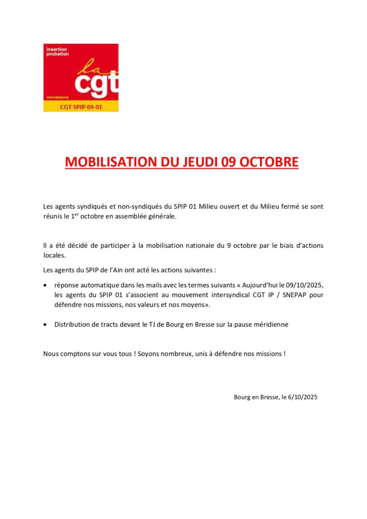 SPIP 01: MOBILISATION DU 9 OCTOBRE 2025